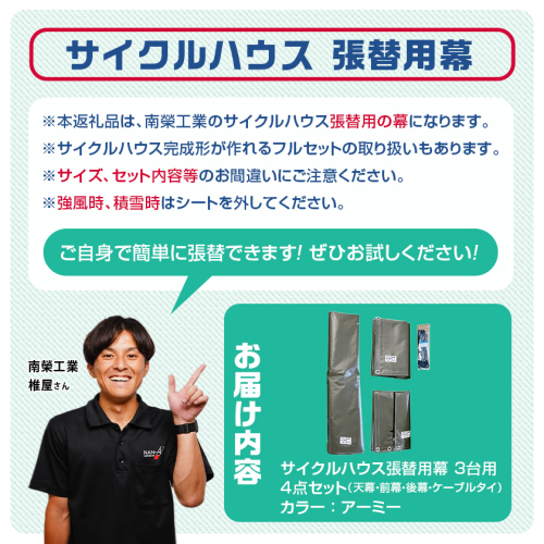 ※本返礼品は、南榮工業のサイクルハウス3台用の張替用の幕4点セットになります。