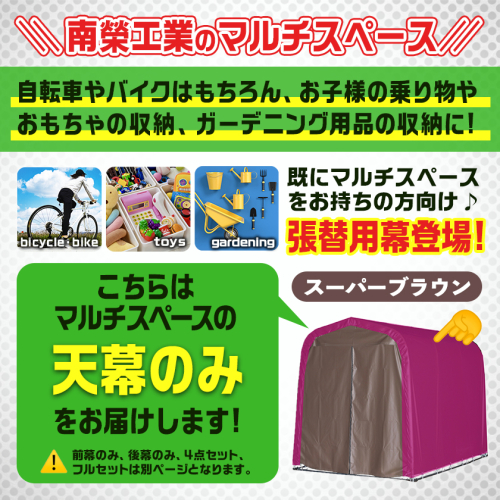 \\南榮工業のマルチスペースの替幕が登場// パイプ車庫の実績と性能をそのままマルチスペースに応用しました。自転車やバイクはもちろん、お子様の乗り物やおもちゃの収納、ガーデニング用品の収納にもとても便利なマルチスペースの張替用の天幕です。 耐久性の高い、ターポリン生地を使用しており、雨や風・ホコリからしっかりガード! ◇−特徴−◇ ・耐候性、耐久性に優れたターポリン生地(PVC)を使用 ・部分的に幕の交換ができるので、コストが安く、長期間お使いいただけます