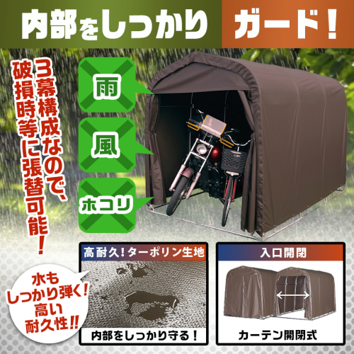 耐久性の高い、ターポリン生地を使用しており、雨や風・ホコリからしっかりガード!