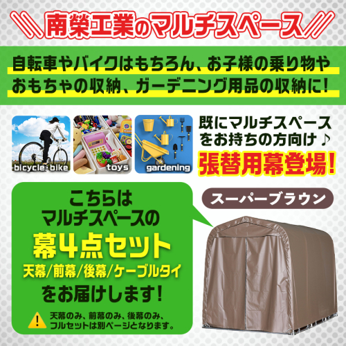 パイプ車庫の実績と性能をそのままマルチスペースに応用しました。自転車やバイクはもちろん、お子様の乗り物やおもちゃの収納、ガーデニング用品の収納にもとても便利なマルチスペースの張替用の幕(天幕・前幕・後幕)とケーブルタイの4点セットです。
