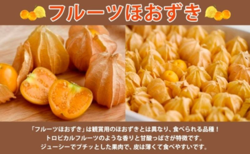 通常のほおずきと異なり、そのまま食べられるフルーツほおずきは、甘味と酸味のバランスが絶妙で、何とも言える芳醇な香りが特徴です。他の果実にはないトロピカルで濃い味わいは、一度食べたら忘れられない美味しさ。その独特の風味と爽やかな香りは、多くのお客様の食卓に新しい彩りと喜びをもたらしています。口の中に広がる豊かな香りと、濃厚な甘みをお楽しみください。