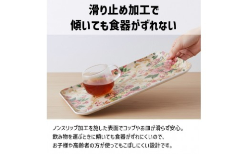 表面はすべり止め加工で、コップやお皿がずれにくく配膳中のヒヤッとを軽減します。