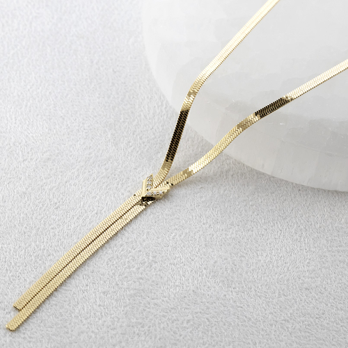 首元を美しく演出するラリエットデザインは縦ラインでスッキリ見せ