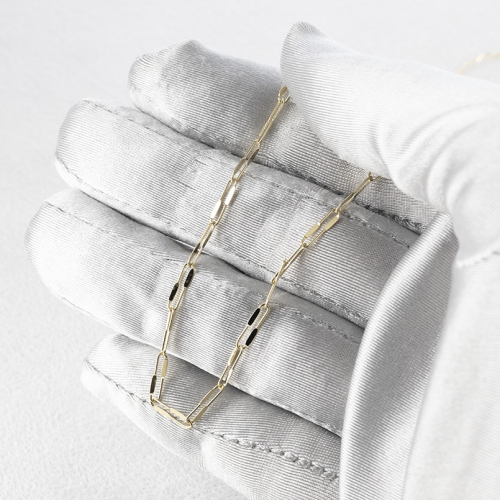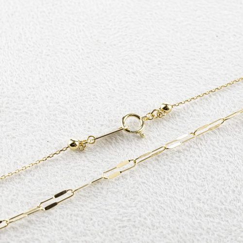 K18ハーフプレスチェーンが首元に輝きを添え、装いを華やかに演出