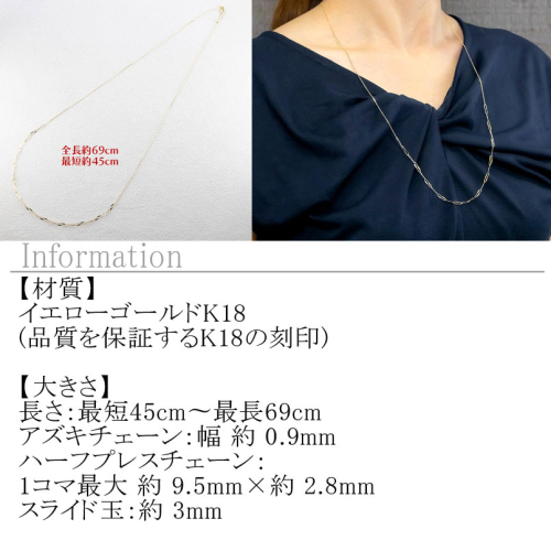 18金 ネックレス チェーンのみ 最長69cm~最短45cm レディース アズキチェーン クリップ型 折り返し式 ゴールド 18k イエローゴールドK18 シンプル チェーンだけ250919mro200y SWAA360