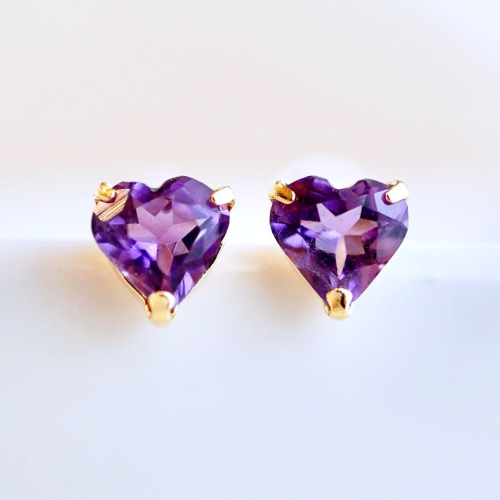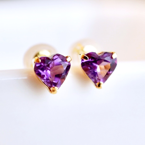 【商品詳細】 K18のアメシストのピアスです。 魅力的なパープルとハートシェイプが耳元で上品に煌めきを放ちます。 石はインクルージョンの少ない上質で色の濃いものを厳選しております。 スタッドタイプでシンプルなので様々なシーンにも合わせやすいアイテムです。 アメシストは2月の誕生石です。 ケースに入れ、リボンをかけてお届けいたします。 【原材料】 素材:K18(18金) イエローゴールド、アメシスト(5mm)