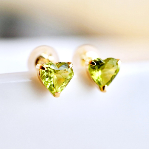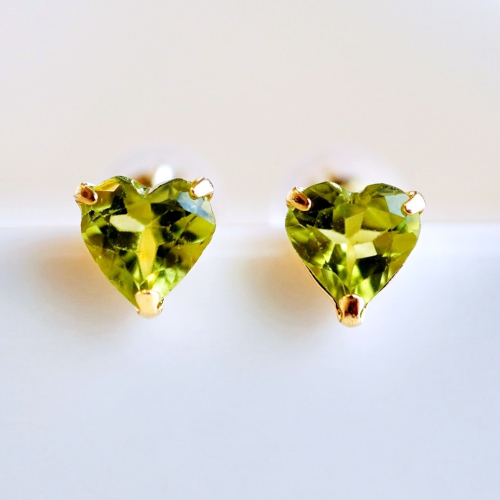 【商品詳細】 K18のペリドットのピアスです。 爽やかなグリーンとハートシェイプが耳元で上品に煌めきを放ちます。 石はインクルージョンの少ない上質で色の濃いものを厳選しております。 スタッドタイプでシンプルなので様々なシーンにも合わせやすいアイテムです。 ペリドットは8月の誕生石です。 ケースに入れ、リボンをかけてお届けいたします。 【原材料】 素材:K18(18金) イエローゴールド、ペリドット(5mm)