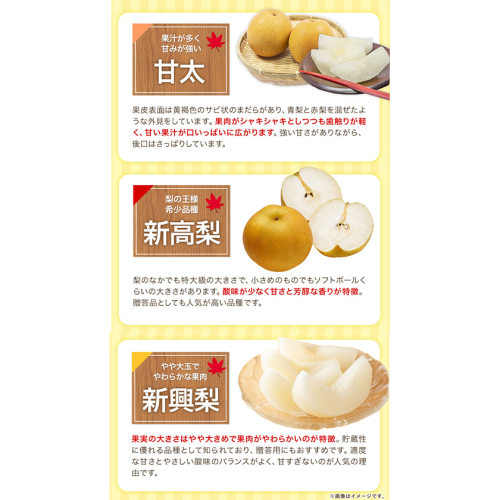 ※旬の梨をお届けいたします。(品種:幸水梨、豊水梨、秋麗梨、あきづき、甘太、新高梨、新興梨、あたご梨のいずれか)