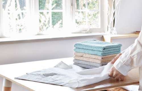 「コンパクトヤーン」という糸の表面を伏せて製造された綿糸を使い織り上げることで、通常の糸と比べて毛羽落ち量が約半分に!お風呂上がりや朝の洗顔で毛羽が身体につく不快感を大幅に改善しました。パイル部分には30番手の細い綿糸を用いてシルクのようなさらりとしなやかは肌触りを実現。厚すぎず薄すぎず暮らしにフィットする丁度いい厚みは、家族分揃えても収納スペースに困らず乾きも早いので、毎日の家事の時短にもつながります。