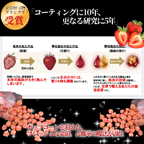 この水分(果汁)に含まれる風味と味を原材料に移し、独自の技術を駆使しキャラメルポップコーンへと変化させる。