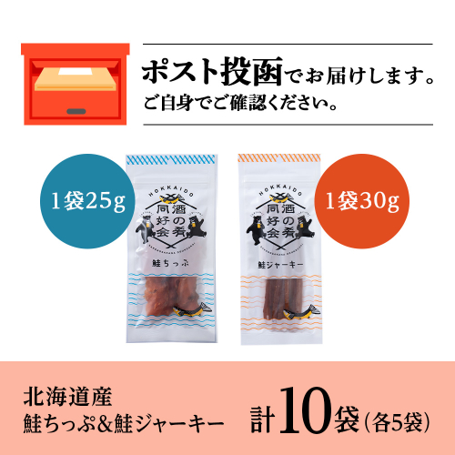 鮭チップ25g 鮭ジャーキー30g 各5袋 おつまみ 酒の肴 プレゼント おやつ ビール日本酒のあてに 御祝い 細長い ジャーキー シャケ 北海道 <佐藤水産>