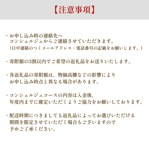 ・コンシェルジュコースの内容は入金後、年度内までに確定いただくようご協力をお願いしております。また配送時期につきましても返礼品によってお選びいただける期間を限定させていただく場合もございますので予めご了承ください。