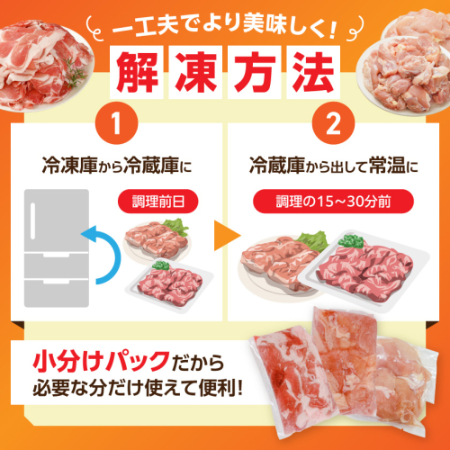 宮崎県産豚肉の切り落としと、カット済みの鶏もも肉&むね肉の【総重量4.5kg】をお届けします。