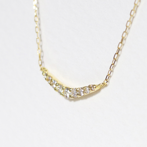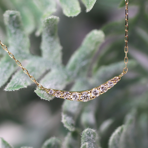緩やかなカーブを描くフォルムが美しいペンダント。 9粒の天然ダイヤモンドをグラデーションセッティングしました。 デコルテに添うデザインが胸元を華やかに演出します。 ホワイトゴールド・ピンクゴールドでも作成可能。 ———注意事項——— ・通常K18イエローゴールドの納品ですが、 K18ホワイトゴールド・K18ピンクゴールドも作成可能です。 ご相談ください。 ・色味や石に個体差があるため、 画像と若干の違いがでる場合があります。