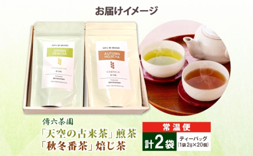 - 2種セット 天空の古来茶 煎茶 秋冬番茶焙じ茶 ティーバッグ 各2g×20個入 各1袋 計2袋 在来茶 緑茶 ほうじ茶 グリーンティー TEA 飲み比べ プレゼント 贈り物 送料無料 傳六茶園 岐阜県 揖斐川町