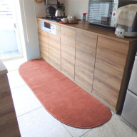 織物の優しいふみ心地がキッチンタイムを心地よくしてくれます。 裏面は滑りにくい加工を施しています。 クールでモダンな曲線が印象的な「ゆりかご型」、 カラーは大人可愛い「ライトマホガニー」でキッチンを演出! アクリル100%、製造地:泉佐野市