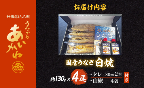- 国産うなぎ白焼 4尾(約130g×4尾)セット タレ・山椒付き うなぎのあいかね 鰻 白焼き 土用の丑の日 贈答 レンチン 浜名湖 冷凍 静岡 浜松市 【配送不可:離島】