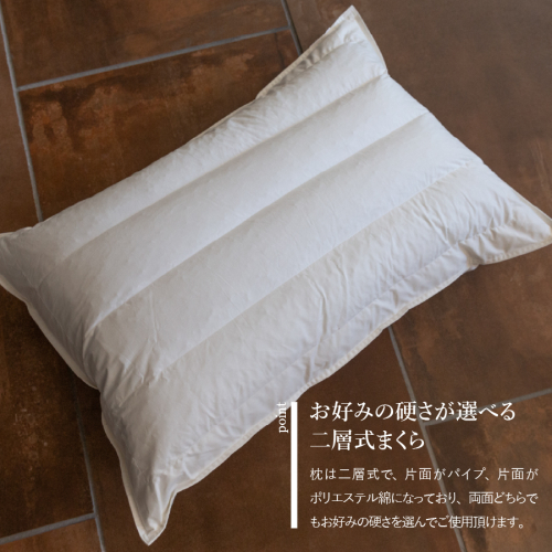枕は2層式で、片面がパイプ、片面がポリエステル綿になっております。両面どちらでもお好みの硬さを選んでご使用ください。