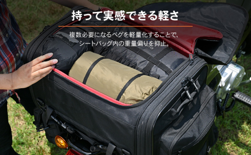 ■忍者の知恵をキャンプに。デイトナが放つ、遊び心と機能の融合。 静岡県森町に本拠地を置く、バイクアフターパーツのトップメーカー「株式会社デイトナ」。 現在、キャンプ用品を広く展開しているデイトナが、日本古来の忍具「クナイ」をモチーフにデザインしたのが、このアルミ鍛造ペグです。 ■軽量かつ強靭。「アルミ鍛造」というこだわり。 ただのアルミペグではありません。 高い強度を誇る「鍛造製法」を採用することで、硬い地面にもしっかりと打ち込めるタフさを実現しました。 軽量なので、複数の持ち運びが必要なキャンプでも、パッキングの負担を軽減します。 ■どんな地面も逃さない、計算された異形断面。 忍者の道具”クナイ”を彷彿とさせる独特のシャフト形状は、デザイン性だけではありません。 やわらかい地面ではこの異形断面が土をしっかりと捉えて抜けにくく、硬い地面ではスムーズに食い込みます。 あらゆるフィールドに対応するその姿は、まさに現代の忍者の道具。