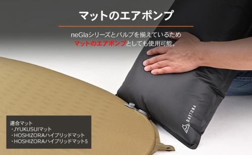 〇エアポンプ機能:デイトナ製「HOSHIZORAハイブリッドマット」のエアポンプとしても使用可能。直接口をつけずに膨らませられるため、衛生的かつスピーディーに寝床が完成します。
