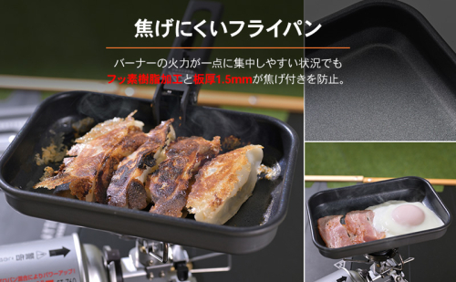 フライパンはフッ素樹脂加工済みで、焦げ付きにくく後片付けも簡単です。