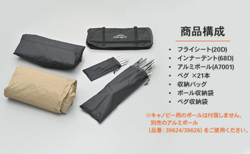 ●構成内容:フライシート、インナーテント、ポール、ペグ、張り綱、収納袋