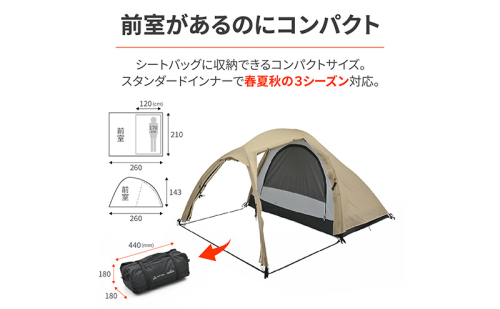 前室の広さと軽量コンパクトさを両立させた、まさにツーリングテントの決定版です。