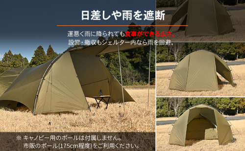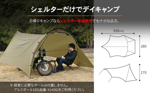 設営もシンプルで、別売の「ポール165」を一本加えるだけで、誰でも簡単に美しいシルエットのシェルターを構築できます。