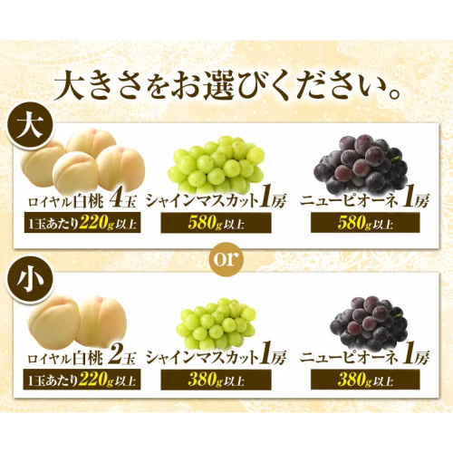 ・【小】岡山白桃2玉(ロイヤル220g以上)+シャインマスカット1房(380g以上)+ニューピオーネ1房(380g以上)