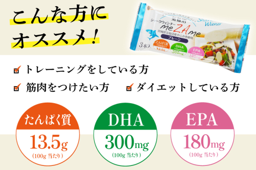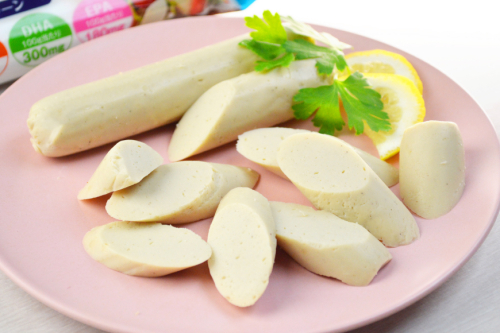 宮城県気仙沼市で水揚げされたヨシキリザメ・ネズミザメ(モウカザメ)と魚肉ソーセージの原料で使用されるスケソウダラを混ぜ込んで、やさしい食感に仕上げた身体づくりの補助食品です。