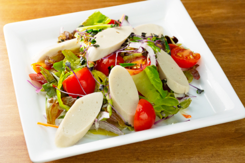 魚肉(ヨシキリザメ(宮城県産)、スケトウダラ(アメリカ)、ネズミザメ(宮城県産))、結着材料(でん粉、粉末状大豆たん白)、サーモンオイル、砂糖、食塩、白胡椒、オレガノ、バジル、ガーリック/ソルビトール、ゲル化剤(増粘多糖類)、調味料(アミノ酸等)、(一部に大豆・さけを含む)