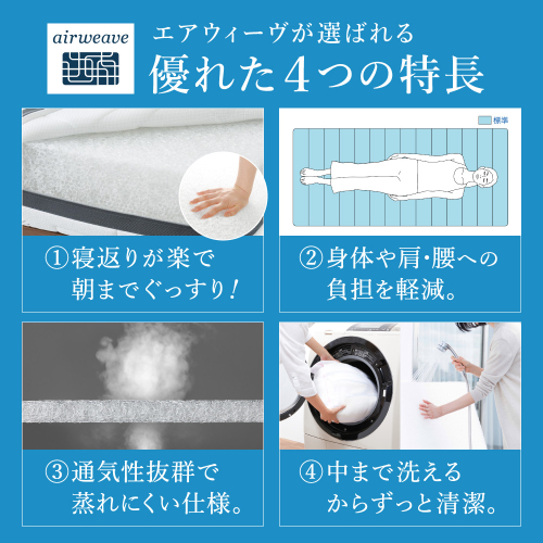 関連キーワード:airweave エアウィーブ マットレス マットレスパッド 寝具 敷布団 敷き布団 布団 ふとん 快眠 睡眠 シーツ カバー セット 夏用 冬用 洗濯可 洗濯 洗える 3年保証 綿 綿100% グレー ベージュ ピンク 幸田町 愛知県