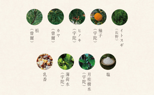 【原材料】 松、カヤ、ヒノキ、柚子、イトスギ、乳香、薄荷水、月桂樹水、塩、エタノール