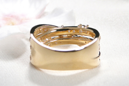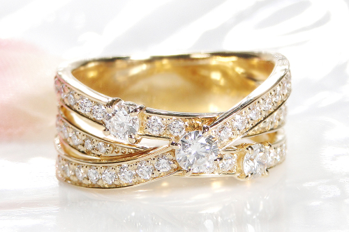 立体的に交差するK18イエローゴールドのクロスフォルムに、トータル0.98カラットの厳選されたダイヤモンドを豪華にあしらいました。