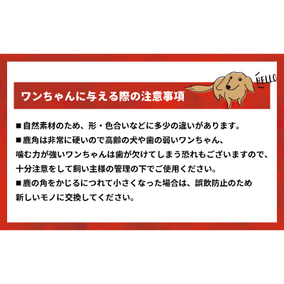 ・鹿角は非常に硬いので高齢の犬や歯の弱いワンちゃん、噛む力が強いワンちゃんは歯が欠けてしまう恐れもございますので、十分注意をして飼い主様の管理の下でご使用ください。