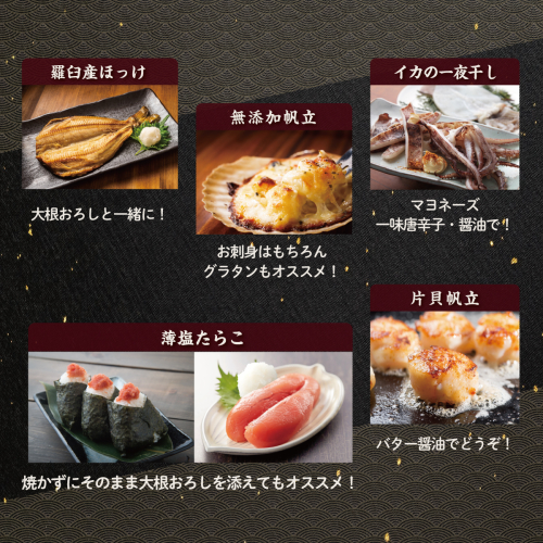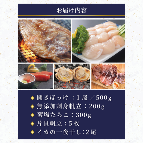 開きほっけ・イカの一夜干し・無添加刺身帆立・薄塩たらこ・片貝帆立をお届けします。
