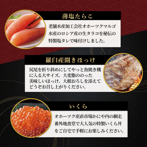 いくら・無添加刺身帆立・片貝・たらこ・開きほっけをお届けします。