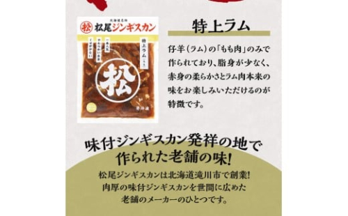 仔羊(ラム)の「もも肉」のみで作られた特上ラム!4パックセット!!松尾ジンギスカンは1956年、北海道滝川市で創業。 味付ジンギスカンを世間に広めた老舗のジンギスカンメーカーです。
