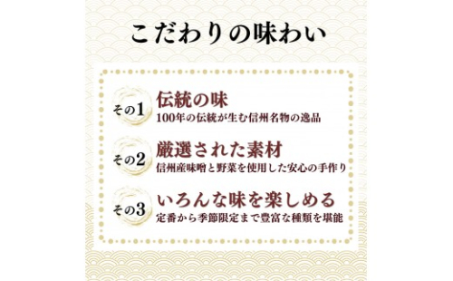 地元の野菜を使用し当店独自の味つけで仕上げ、定番の野沢菜他、季節の野菜の旨みがお楽しみ頂ける食感の違う2種のヘルシーおやきを是非ご賞味下さい。