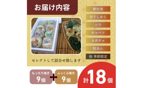 - 大名おやき 18個(のざわな・切干しめじ・にら・きゃべつ・かぼちゃ・粒あん、他季節限定おやきをセレクトして詰合せ)