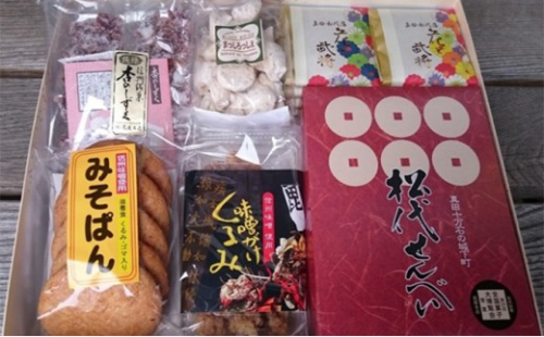 - 1箱【松代せんべい24枚・花と武将サブレ8枚・まっしろっしぇ(くるみメレンゲ)50g・杏のしずく180g・みそパン5枚入・くるみ味噌掛け100g】