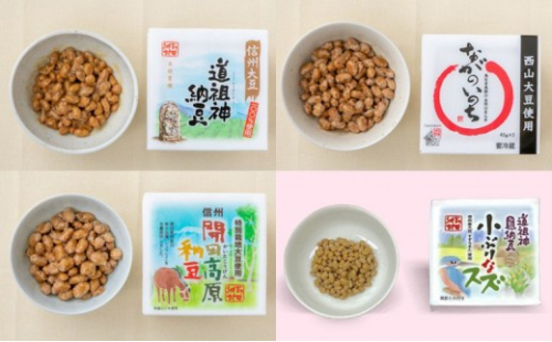 - 道祖神納豆(45g×3)、西山大豆のながのいのち納豆(45g×3)、開田高原納豆(45g×3)、小ぶりなスズ(45g×3)、しっかり小粒納豆(40g×2)、古今納豆小粒(80g)、安曇野大粒納豆(80g) 7種各1個