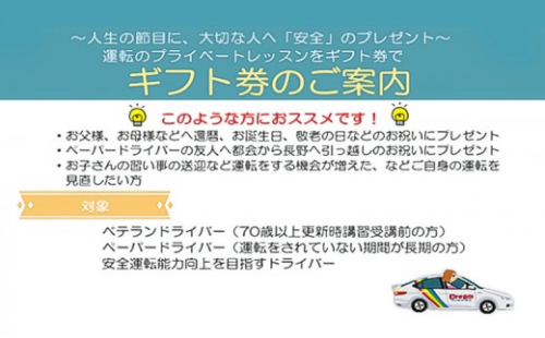 ~人生の節目に、大切なあの人へ「安全」のプレゼント~ 教習所指導員のプライベートレッスンが受けられるギフト券です。★ご両親へ還暦、お誕生日、敬老の日のお岩ににプレゼント★ペーパードライバーの友人にプレゼント★運転の機会が増えた、車が変わったなど自身の運転を見直したい方●レッスン内容は、不安項目に応じたオーダーメイドが可能です!●1枚あたり50分のレッスン、6,600円(税込)相当●本ギフト券ご利用で、連続2時間以上の講習に対しては、講習レポートを発行させて頂きます!