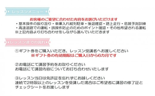 レッスン当日の持ち物:当該ギフト券、運転免許証。レッスン当日の服装:運転しやすい服装と靴。免許証に「眼鏡等」の条件の有る方は、眼鏡またはコンタクトでお越しください。当日キャンセルは、レッスン開始の30分前まで。悪天候等の理由でレッスンを中止する場合があります。ご利用対象車種は、普通車に限定されます。他社種については、スタッフまでお問い合わせください。車両のお持ち込みはできません。本ギフト券利用時は、初回手数料は掛かりません。本ギフト券ご利用で、連続2時間以上の講習に対しては、講習レポートを発行させて頂きます。いかなる理由においても、返金、換金は致しかねます。講習実施日において有効期限が過ぎた場合は使用できません。本ギフト券は、ふるさと納税返礼品につき、ドリームモータースクール昭和のみでお使い頂けます。ドリームモータースクール須坂ではお使い頂けません。