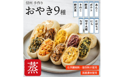 ・おやき 1コ約100g×9コ(野沢菜・切干大根・きのこ・あんこ・なす・野菜・ポテト・にら・かぼちゃ 各1コ)