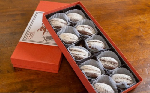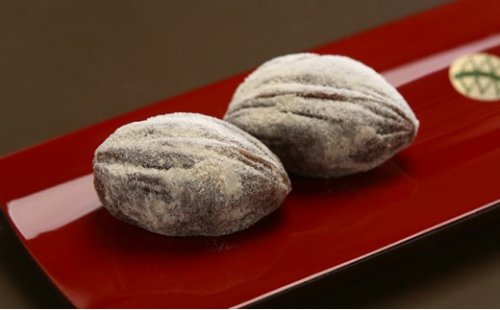 【そば餅】白玉粉とワラビ粉を使用した柔らかい餅生地で小豆こし餡を包み、そば粉をまぶしました。解凍後、電子レンジで数秒温めてお召し上げりいただくと出来立ての食感をお楽しみいただけます。