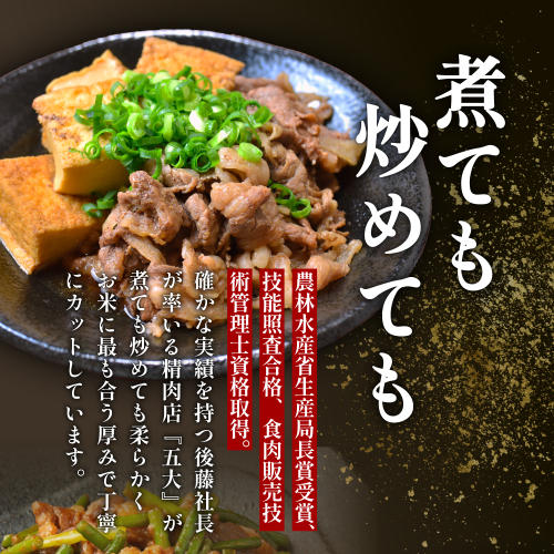 農林水産省生産局長賞受賞、技能照査合格、食肉販売技術管理士資格取得という確かな実績を持つ後藤社長が率いる精肉店「五大」が、肉の繊維を見極めながら一枚一枚丁寧に仕上げた牛肉切り落としです。