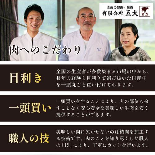 農林水産省生産局長賞受賞、技能照査合格、食肉販売技術管理士資格取得という確かな実績を持つ後藤社長が率いる精肉店「五大」が、肉の繊維を見極めながら一枚一枚丁寧に仕上げた牛肉切り落としです。