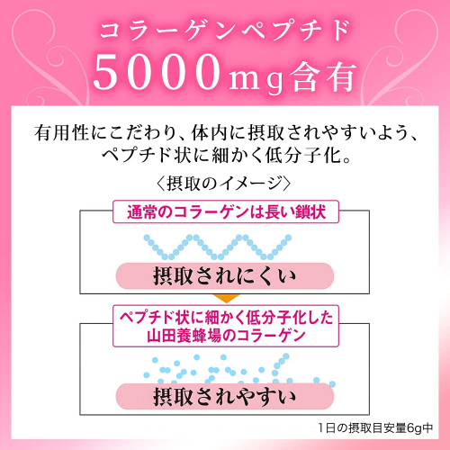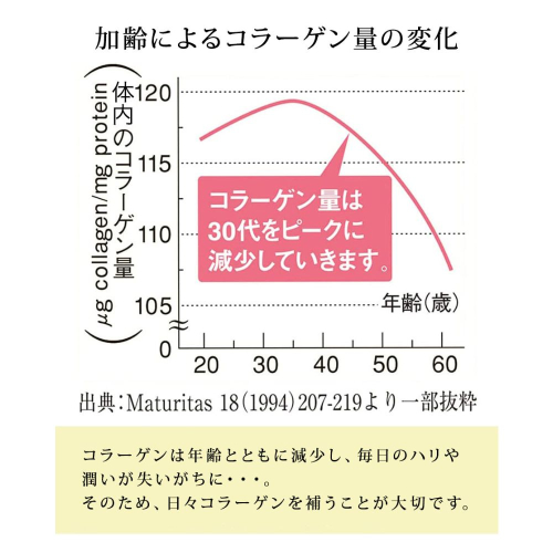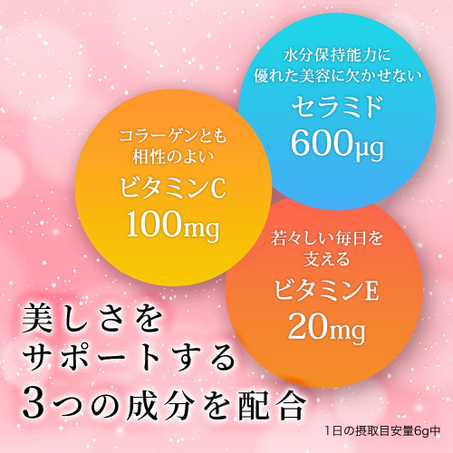 年齢とともに体内で生成されにくくなるコラーゲンを摂取しやすいよう、あらかじめペプチド状に低分子化。若々しさや健康をサポートする3つの成分、ビタミンC、ビタミンE、セラミドを配合。