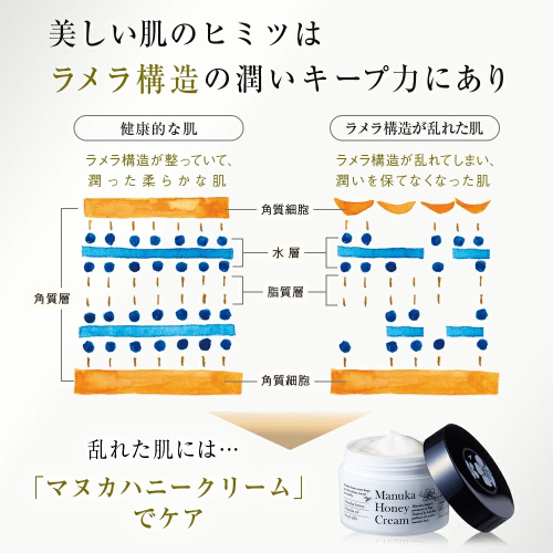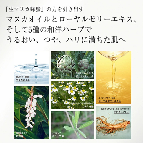 抗菌作用や創傷治癒効果で注目されているマヌカ蜂蜜を配合した『毛穴の黒ずみや開き』『乾燥』をケアするクリームです。5種の和洋ハーブエキスを配合し、マヌカオイルのグリーンフレッシュの爽やかな香りが広がるクリームが、なめらかな肌へ整えます。伸びがよくなめらかな使用感で、べたつきが残らず、しっとり感が続きます。